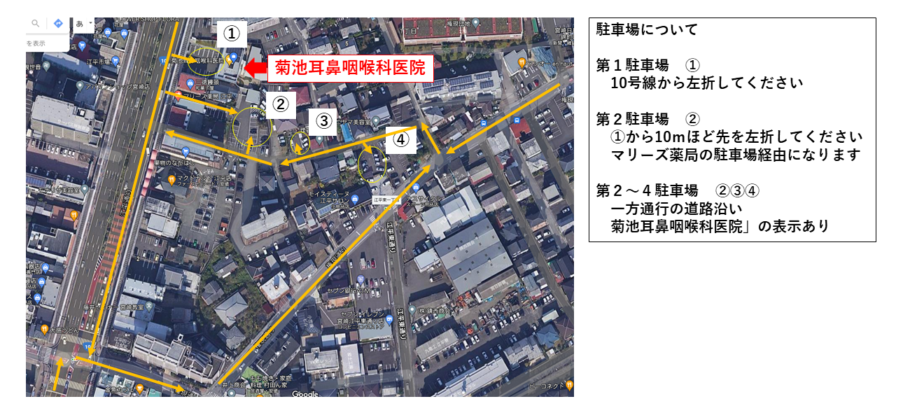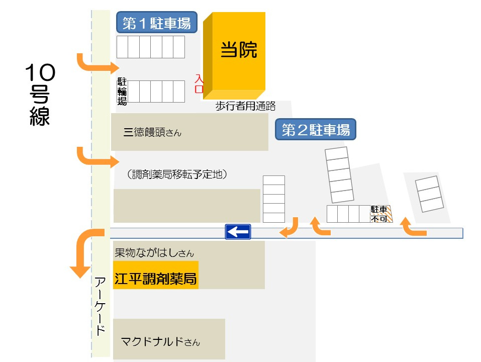 橘通り方面から車でお越しの方は、国道10号線からは医院正面の第1駐車場へは右折進入できませんので手前信号で右折していただき、第2駐車場をご利用ください。