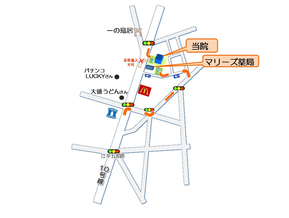 橘通り方面から車でお越しの方は、国道10号線からは医院正面の第一駐車場には右折進入できませんので、手前信号で右折していただき第2~第5駐車場をご利用ください。